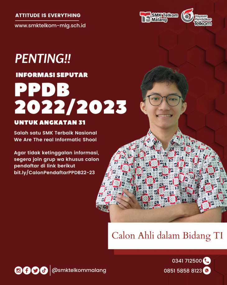 Hai Adik - Adik yang saat ini duduk di bangku kelas IX SMP, SMK Telkom Malang punya informasi terbaru menganai Penerimaan Peserta Didik Baru Tahun Ajaran 2022/2023. Bagi kalian yang berminat untuk mendaftar atau mencari info mengenai SMK Telkom Malang, silahkan segera bergabung di grup WhatsApp pada link bit.ly/CalonPendaftarPPDB22-23&...