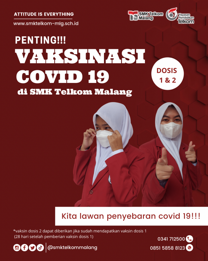 Dalam rangka mendukung program pemerintah untuk memberantas penyebaran Covid-19, SMK Telkom Malang mangadakan vaksinasi yang dibuka untuk pelajar Moklet ataupun non Moklet dan warga umum. Vaksinasi akan dilaksanakan pada Senin, 25 Oktober 2021 dengan total 1000 peserta. Jenis vaksin yang diberikan yaitu astra zeneca dan sinovac dan dapat diikuti oleh peserta dengan dosis pertama maupun kedua...