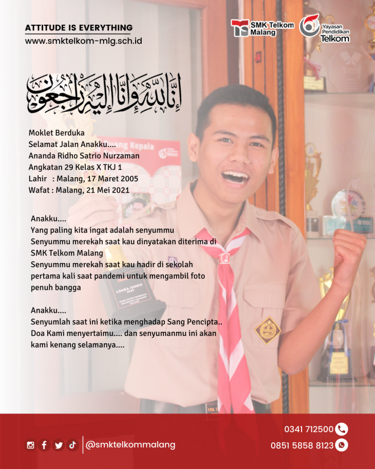 Innalillahi wa innalillahi rojiun, Moklet bedurka. Telah berpulang kepada Sang Pencipta, anak kami, putra kami ananda Ridho Satrio Nurzaman. Belum sempat raga ini bertemu dalam pembelajaran dikelas karena pandemi akan tetapi kita telah terpisahkan dengan ananda tercinta untuk selama lamanya. Selamat jalan anakku, doa kami semua menyertaimu.
